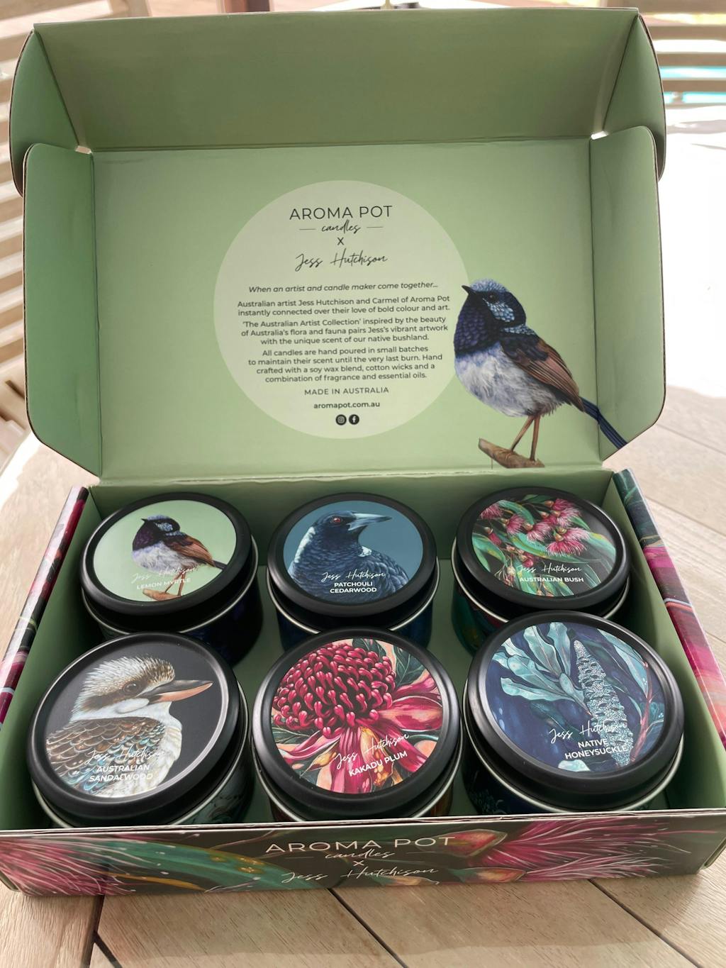 [{"id":161156759621,"handle":"all-products","updated_at":"2026-03-06T22:40:13+10:30","published_at":"2020-07-25T21:51:25+09:30","sort_order":"manual","template_suffix":"","published_scope":"web","title":"All products","body_html":"\u003cp\u003eCan't decide or just want to browse the lot. This is the spot! Which will you choose? \u003c\/p\u003e\n\u003cp\u003eDon't forget we have FREE SHIPPING when you spend over $150\u003c\/p\u003e","image":{"created_at":"2020-07-25T21:51:52+09:30","alt":"scented soy candles and diffusers aroma pot Australian artist","width":2019,"height":2019,"src":"\/\/aromapot.com.au\/cdn\/shop\/collections\/all_4_chevron_3.jpg?v=1755571940"}},{"id":280533499973,"handle":"candle-tins","updated_at":"2026-03-06T22:40:13+10:30","published_at":"2024-10-02T17:38:33+09:30","sort_order":"manual","template_suffix":"","published_scope":"web","title":"Candle tins","body_html":"\u003cp\u003eOur new printed candle tins are perfect for Stockists to add to counter top benches, add them to gift packs and hampers. The perfect price point!\u003c\/p\u003e","image":{"created_at":"2024-10-02T17:48:48+09:30","alt":null,"width":1080,"height":1080,"src":"\/\/aromapot.com.au\/cdn\/shop\/collections\/Australian_artist_mini_soy_candle_tin_pack_aroma_pot_1_square-min.jpg?v=1755571970"}},{"id":46334246948,"handle":"candles-melts","updated_at":"2026-03-06T22:40:13+10:30","published_at":"2019-03-29T21:41:10+10:30","sort_order":"manual","template_suffix":"","published_scope":"web","title":"Candles","body_html":"We have a range of scented soy candles for all budgets. From the best selling artist range for lovers of colour, art and scent to the classic range, perfect for everyday burning and affordable gifting. Each candle has a burn time of 50+hours with stunning long lasting scent from our small batch hand poured production process. We wick, label, pour and pack every single candle in our studio on the edge of the Barossa Valley SA.","image":{"created_at":"2025-06-27T21:35:58+09:30","alt":null,"width":1908,"height":1910,"src":"\/\/aromapot.com.au\/cdn\/shop\/collections\/IMG-0421.jpg?v=1755647531"}},{"id":290447163461,"handle":"gift-packs","updated_at":"2026-03-06T22:40:13+10:30","published_at":"2025-06-09T16:08:00+09:30","sort_order":"manual","template_suffix":"","published_scope":"web","title":"Gift Packs","body_html":"\u003cp\u003eOur Australian artist gift and sample packs are great way to try our products if you're new to our scents or perfect for gifting in these beautiful artist design gift boxes.\u003c\/p\u003e\n\u003cp\u003eOr grab a bargain with our $69 Mystery Pack - over $120 value\u003c\/p\u003e","image":{"created_at":"2025-06-09T16:07:58+09:30","alt":null,"width":4858,"height":4888,"src":"\/\/aromapot.com.au\/cdn\/shop\/collections\/Australian-artist-soy-mini-candle-tin-gift-box-room-spray-rocky-road-Aroma-Pot-Jess-Hutchison-HR-2-min-square.jpg?v=1759976422"}},{"id":262002901061,"handle":"artist-collection","updated_at":"2026-03-06T22:40:13+10:30","published_at":"2021-10-09T21:26:43+10:30","sort_order":"manual","template_suffix":"","published_scope":"web","title":"Jess Hutchison Range","body_html":"\u003cp\u003eOur best selling artist candles and diffusers ... our collaboration with Australian artist Jess Hutchison, based on the South Coast of NSW was first released in 2019 and has been our best seller ever since! This range features vibrant artworks inspired by Jess's local surroundings and paired with unique scents inspired by our native bushlands.\u003c\/p\u003e\n\u003cp\u003eAll products are hand made by owners Carmel and Garry, who are the heart and soul of the operation and meticulously craft each and every candle or diffuser from start to finish.\u003c\/p\u003e\n\u003cp\u003eThey wick, pour, label and pack all of their products in their home studio, based on the edge of the Barossa Valley, SA.\u003c\/p\u003e","image":{"created_at":"2021-10-09T21:26:42+10:30","alt":"Australian artist soy candles and diffusers Jess Hutchison Aroma Pot for lovers of colour art and scent hand poured soy coconut wax blend Barossa Valley","width":1908,"height":1910,"src":"\/\/aromapot.com.au\/cdn\/shop\/collections\/scented_soy_wax_hand_poured_candle_Aroma_Pot_Candles_Jess_Hutchison_Art_Flora_Fauna_Christmas_Gifts_stockists_wholesale_rose_gold.jpg?v=1755647509"}},{"id":54358278180,"handle":"new","updated_at":"2026-03-06T22:40:13+10:30","published_at":"2025-08-06T15:42:41+09:30","sort_order":"manual","template_suffix":"","published_scope":"web","title":"New","body_html":"\u003cp style=\"text-align: left;\"\u003e\u003cspan\u003eIntroducing our newest artist scents and artwork, thank you pack and Christmas candles. \u003c\/span\u003e\u003c\/p\u003e","image":{"created_at":"2023-03-27T19:13:34+10:30","alt":"Christmas candle Aroma Pot","width":4480,"height":4480,"src":"\/\/aromapot.com.au\/cdn\/shop\/collections\/image.jpg?v=1755572095"}},{"id":279657709637,"handle":"shop-all","updated_at":"2026-03-06T22:40:13+10:30","published_at":"2024-09-06T21:30:55+09:30","sort_order":"manual","template_suffix":"","published_scope":"web","title":"SHOP ALL","body_html":"","image":{"created_at":"2025-06-09T15:47:45+09:30","alt":null,"width":3408,"height":3408,"src":"\/\/aromapot.com.au\/cdn\/shop\/collections\/Australian-artist-soy-candle-gift-box-Kakadu-plum-Waratah-aroma-pot-Jess-Hutchison-LR-3-square.jpg?v=1755583603"}},{"id":267720556613,"handle":"wholesale","updated_at":"2026-03-06T22:40:13+10:30","published_at":"2023-07-29T17:53:24+09:30","sort_order":"manual","template_suffix":"","published_scope":"web","title":"Wholesale","body_html":"\u003cp\u003eWelcome to our wholesale page. Please contact wholesale@aromapot.com.au for queries.\u003c\/p\u003e\n\u003cp\u003e\u003cspan\u003eMOQ - $350 \u003c\/span\u003e\u003c\/p\u003e\n\u003cp\u003e\u003cspan\u003eSHIPPING - Flat $40 shipping Australia wide. Orders are shipped 1-2 weeks after placement.\u003c\/span\u003e\u003c\/p\u003e\n\u003cp\u003e\u003cspan\u003ePRICING - all 